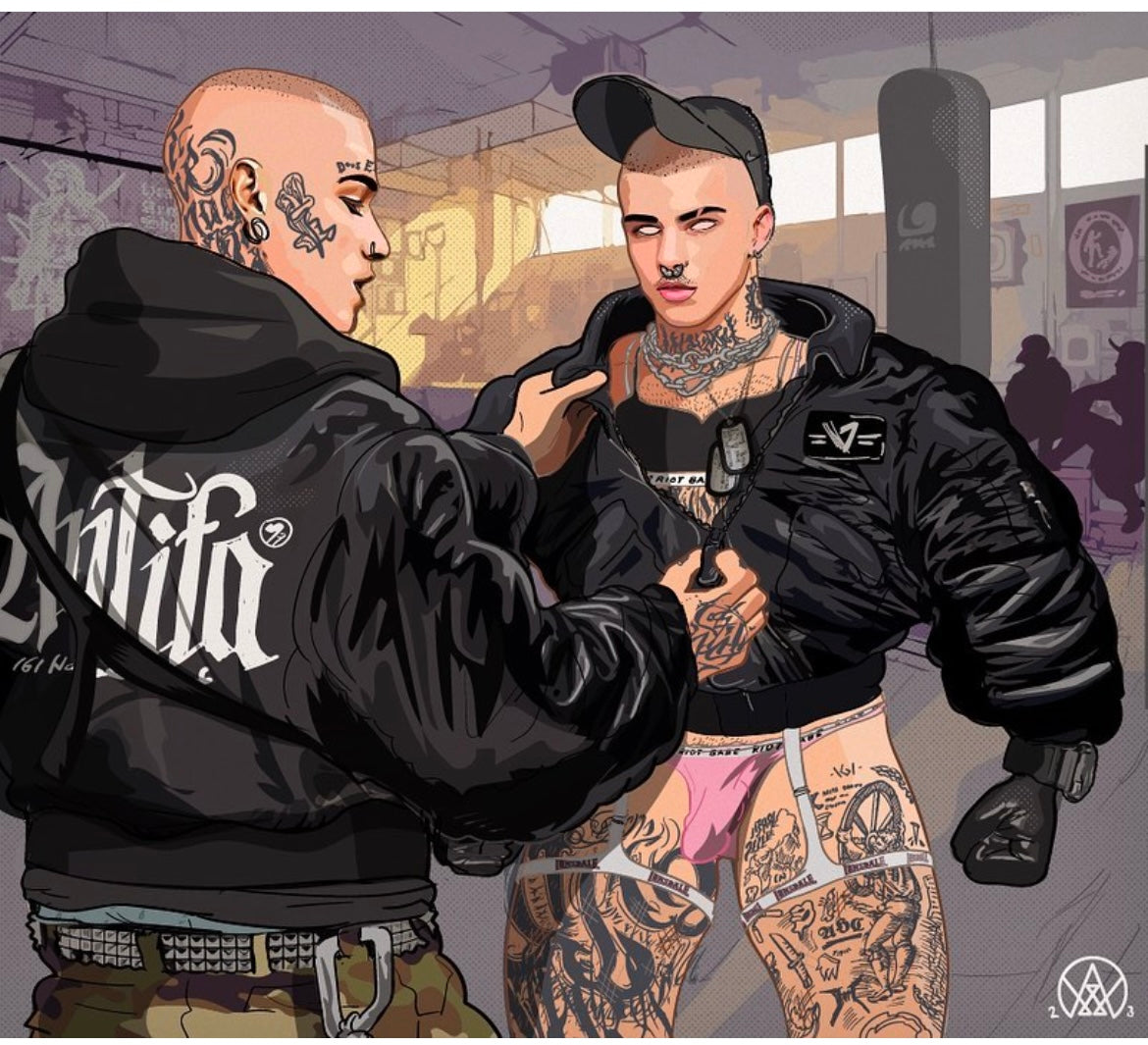 He studied illustration in Germany & New York. His comics introduce new alternative fetish characters in their „uniforms“ to a fetish scene that is obsessed with police and military gear. His artwork is an unapologetic display of deviant fetishes and a celebration of utopian comradery between queers.