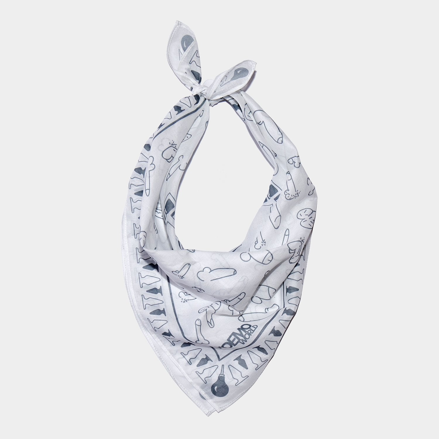 Hoemo World presents the big gay bandana. A beauty if we do say so ourselves, with hand illustrated dicks of all shapes and sizes, with poppers bottle, butt plug and douching bulb borders, centred around a huge cock cage. Wear it boldly with the drawings loud and proud, or twist and fold it to keep things a bit more DL. Made in a lightweight cotton so it's comfortable AF and perfect for styling in any way.