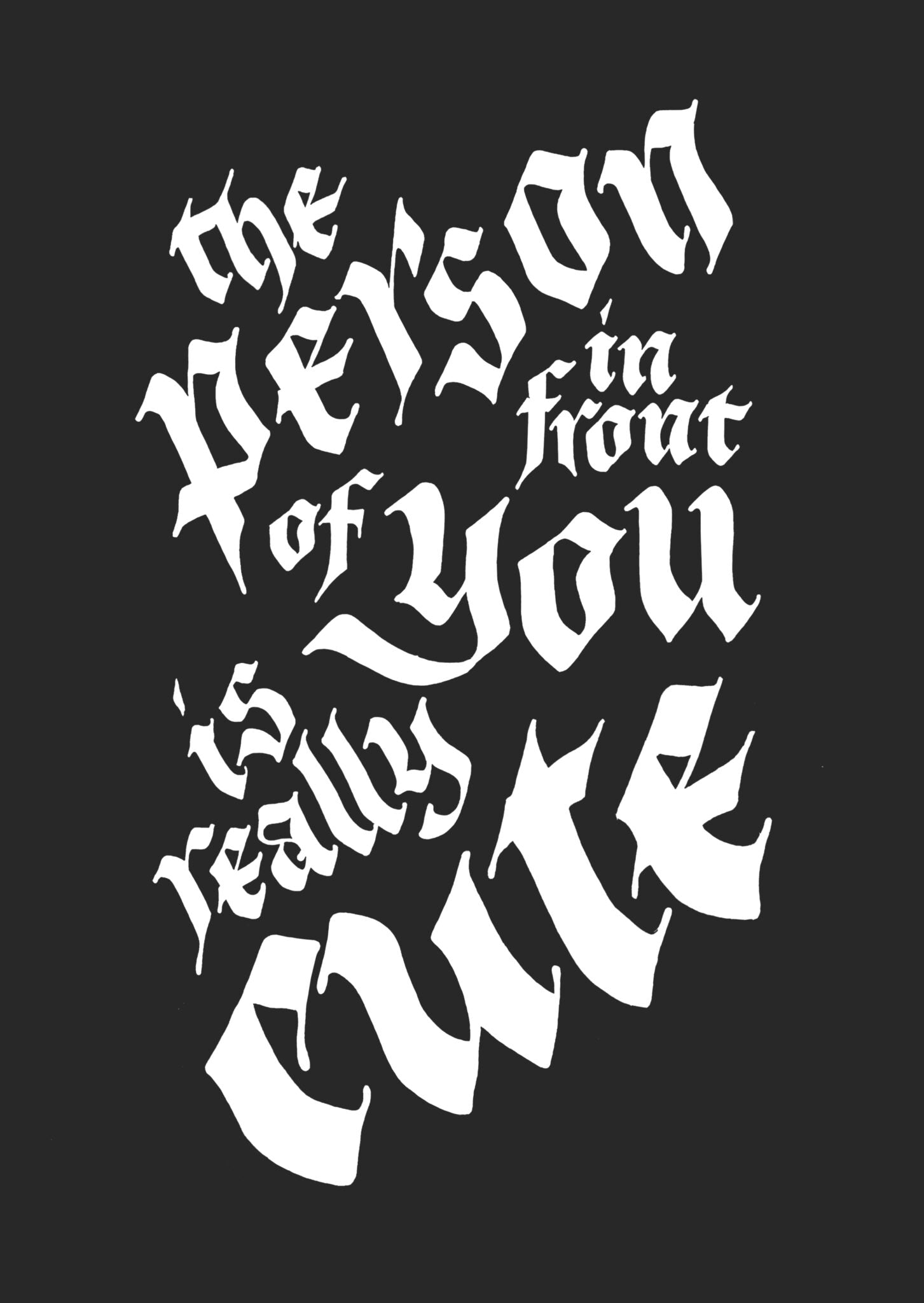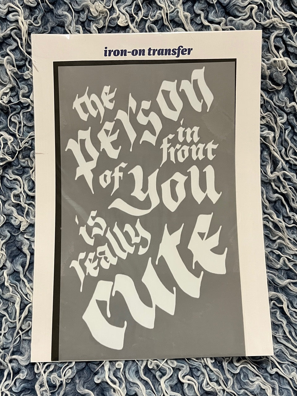 Big Iron-On Transfer "THE PERSON IN FRONT OF YOU IS REALLY CUTE" Black