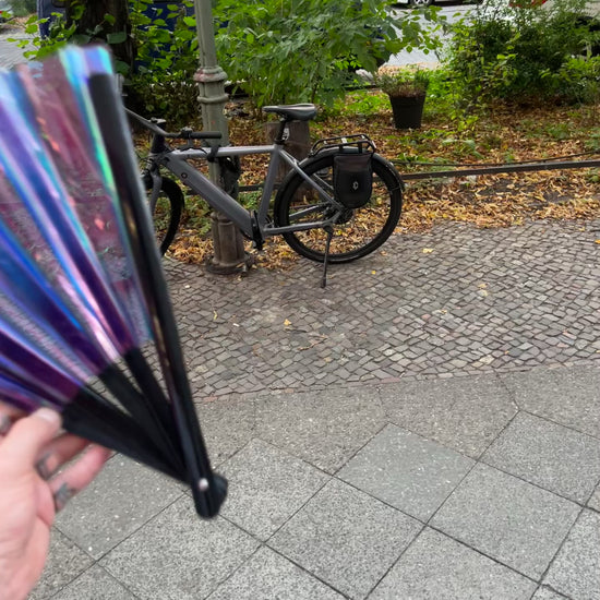 Big shiny Fan "Blue Holo" with Bamboo handle