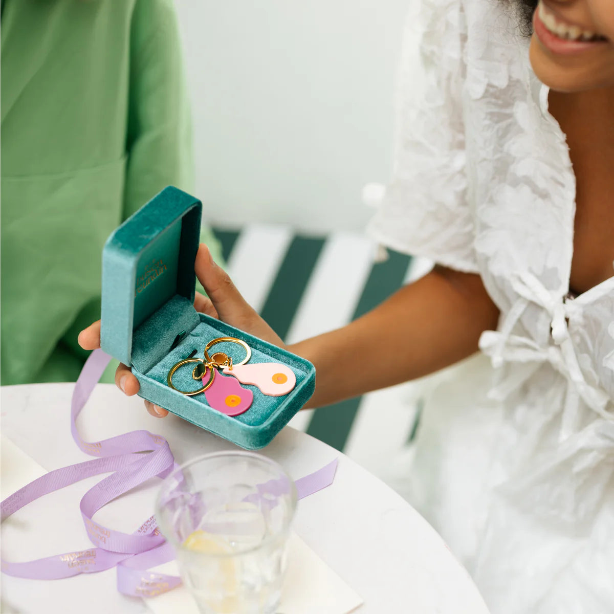 Discover the perfect accessory for you and your best friend: this exclusive key ring set consists of two lovingly designed pendants – two breasts that form a breast heart. These beautiful key rings are the ideal symbol of friendship, solidarity, and individuality. The set is perfect as a friendship key chain. <3