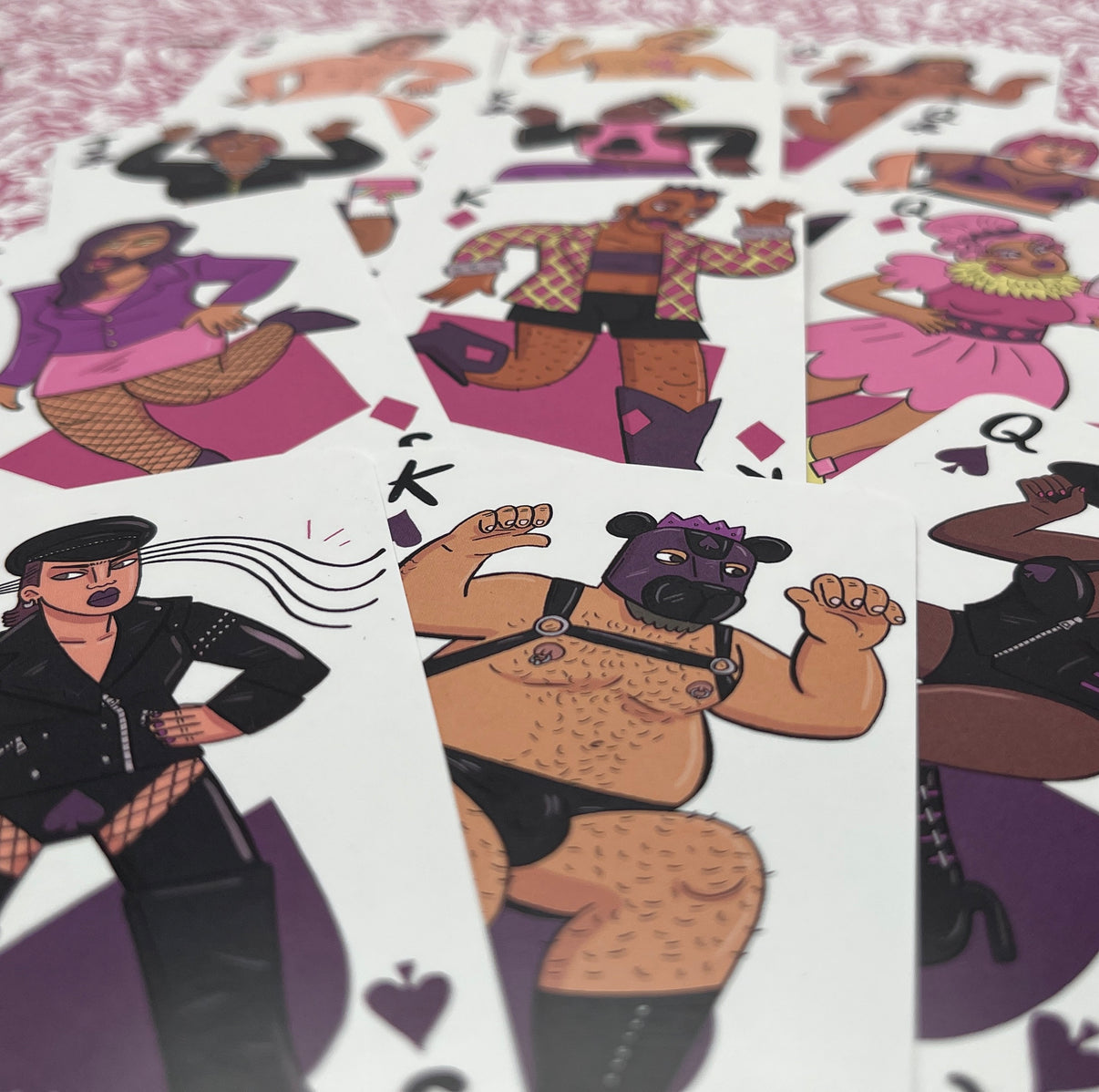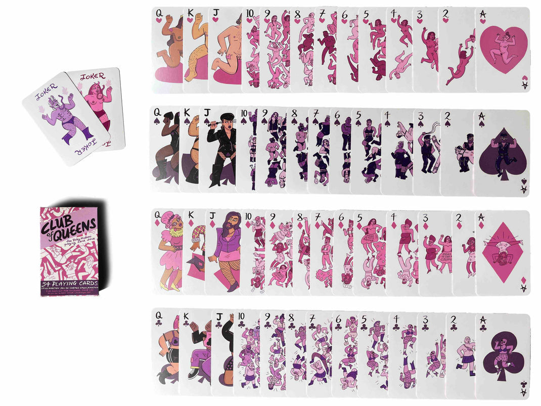 Each suit is dressed according to the characters’ subcultures: Diamonds in drag, Spades in Leather, Clubs in Clubwear, and Hearts in.. nothing at all, they’re naked! As the number of the cards goes up, a new character joins the party, for a total of 54 lovable lil' queer characters across the deck.