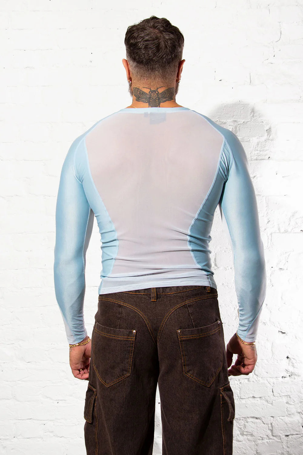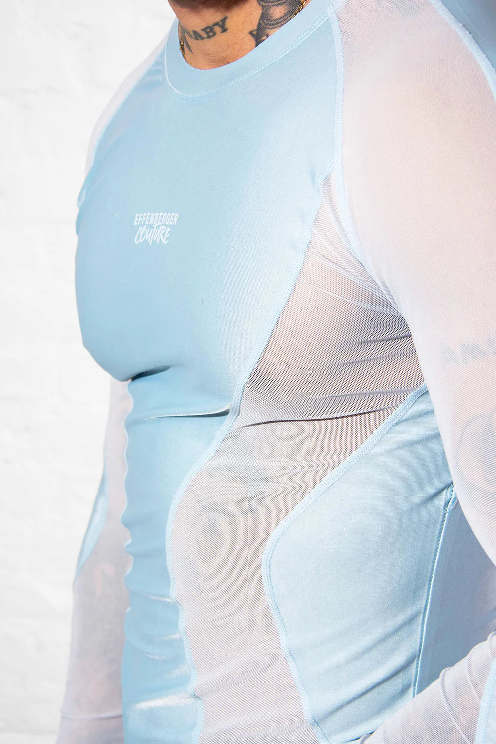 Longsleeve top with wavy hourglass construction. Made from a combination of shiny blue spandex and sheer mesh paneling.