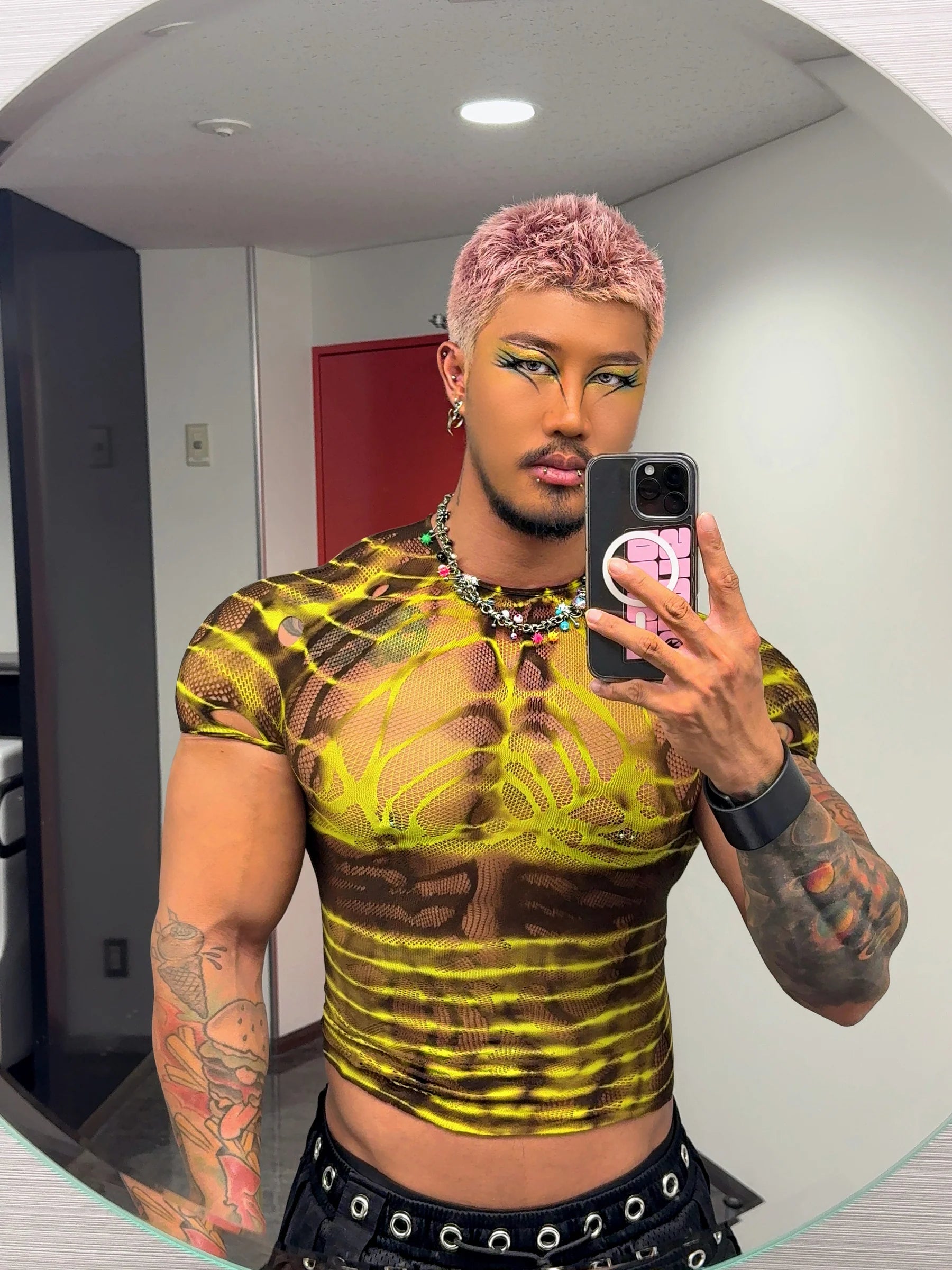 Form-fitting mesh tee in black with a coil pattern of slime yellow through-out. Engineered using LEAK’s signature seamless 3D knitting.