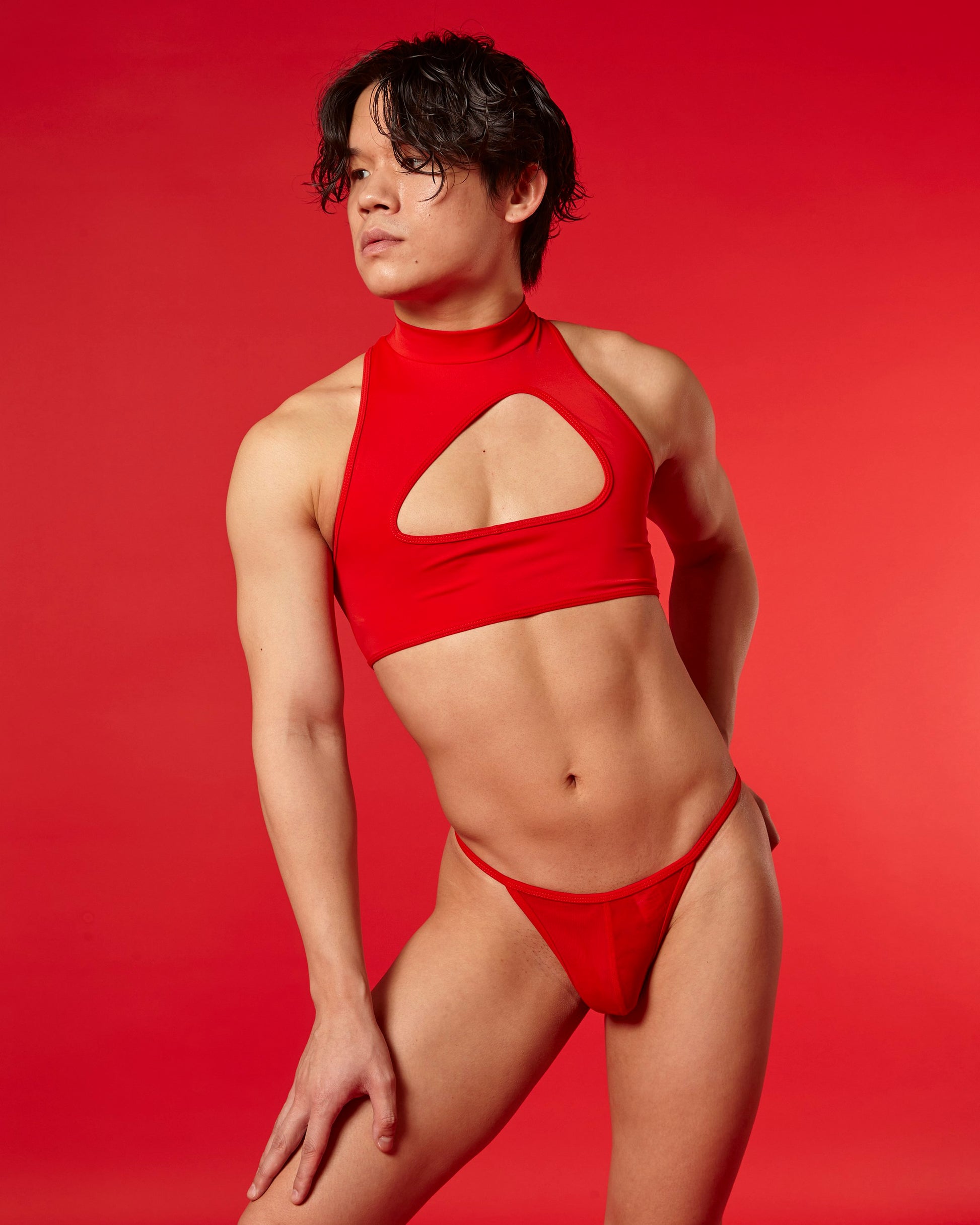 Super cropped tank top featuring an asymmetric front cutout with X-back design. Made with 4-way stretch poly spandex, it's the perfect tank running on the treadmill and raving at the club.