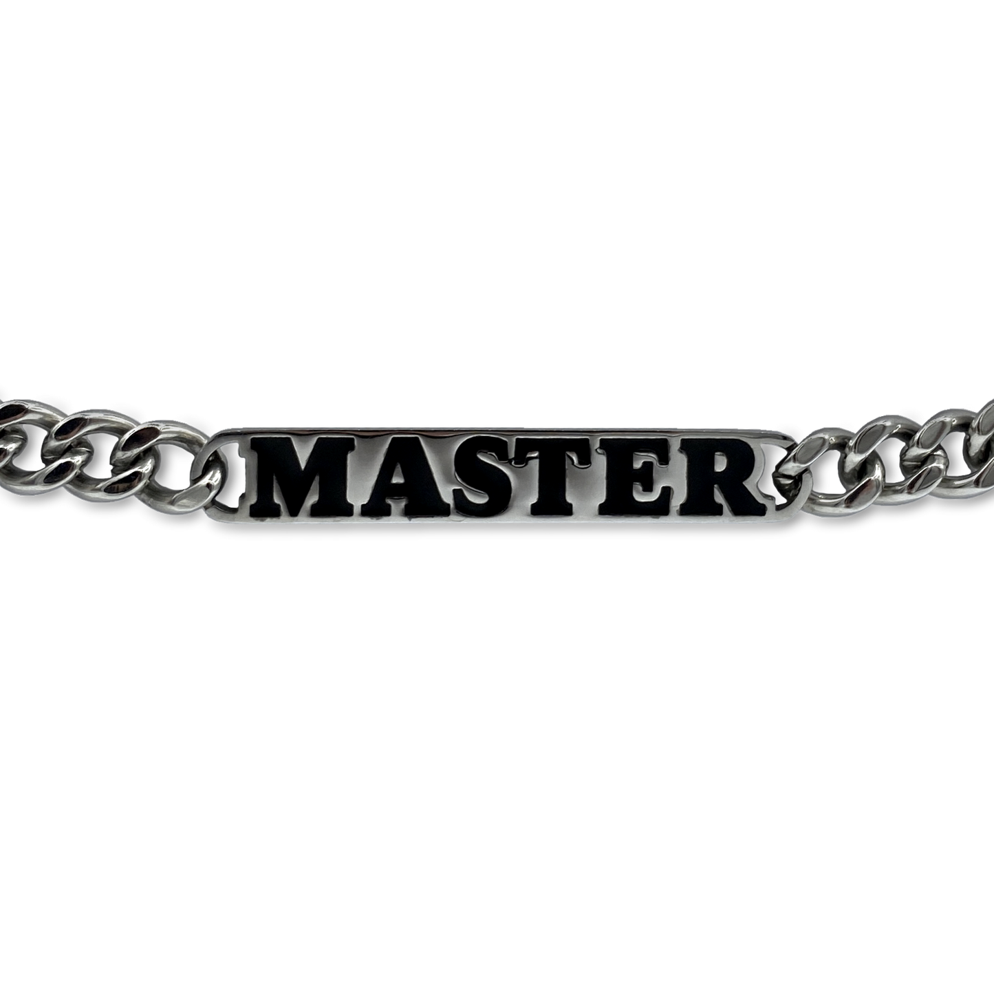 Introducing our sturdy and masculine cuban chain necklace that exudes dominance. Featuring the word "Master," it's perfect for showing who's in charge.