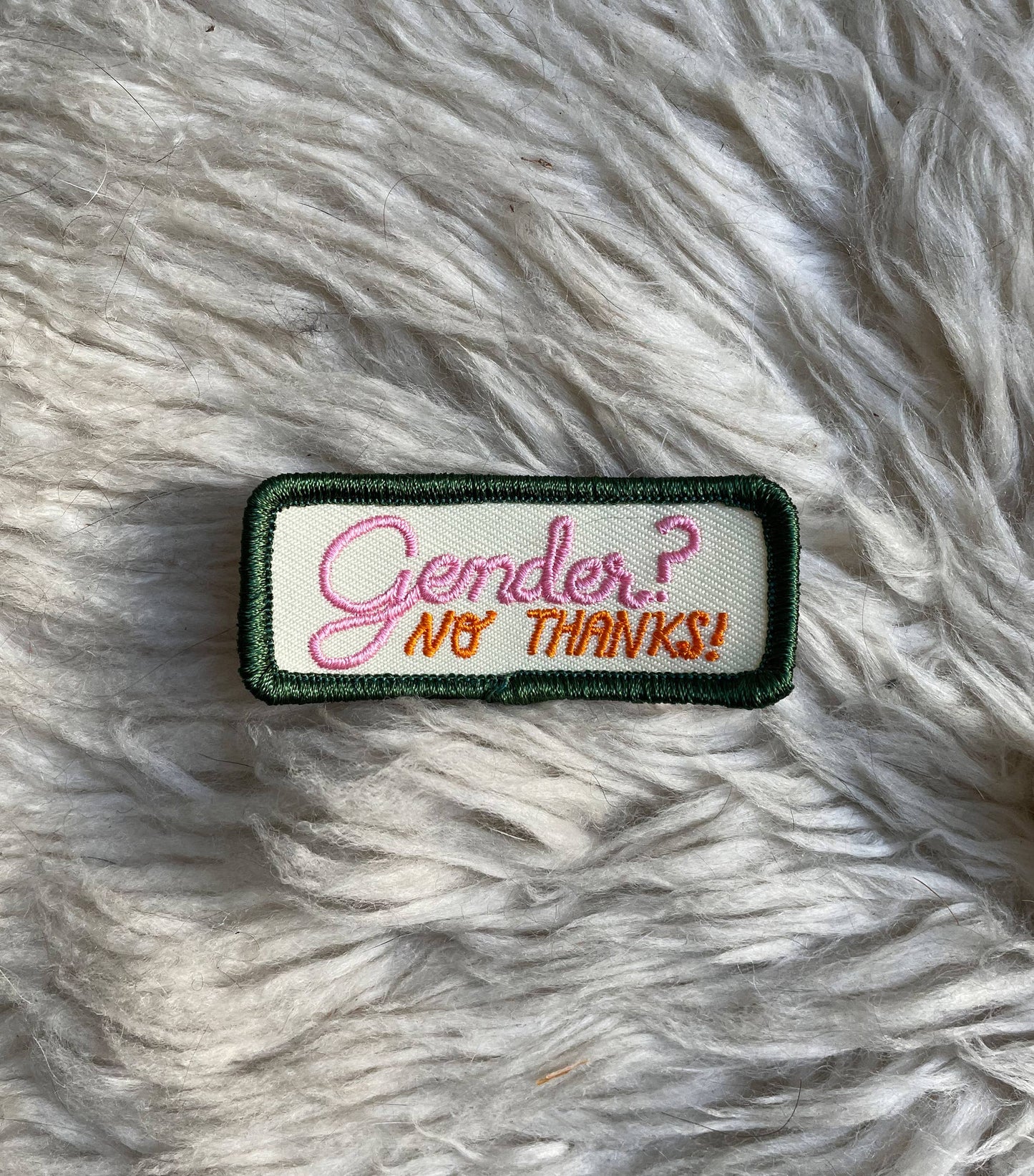 2.5” X 1” embroidered patch to declare that you would kindly like to decline Gender, thanks. Comes glued to A2 size card stock backing. If you prefer no packaging on your patches, please ask. Otherwise, all patches come packaged!