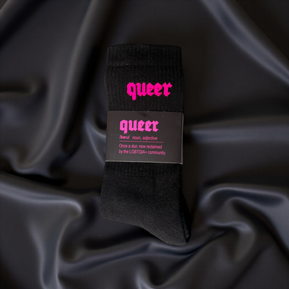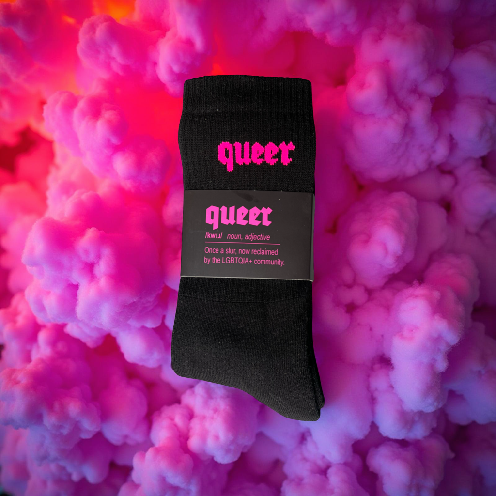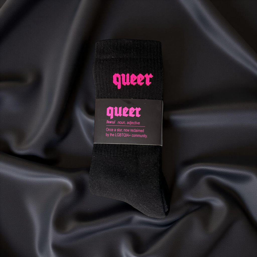 Match these soft and comfy crew socks with our “Queer” Tees.