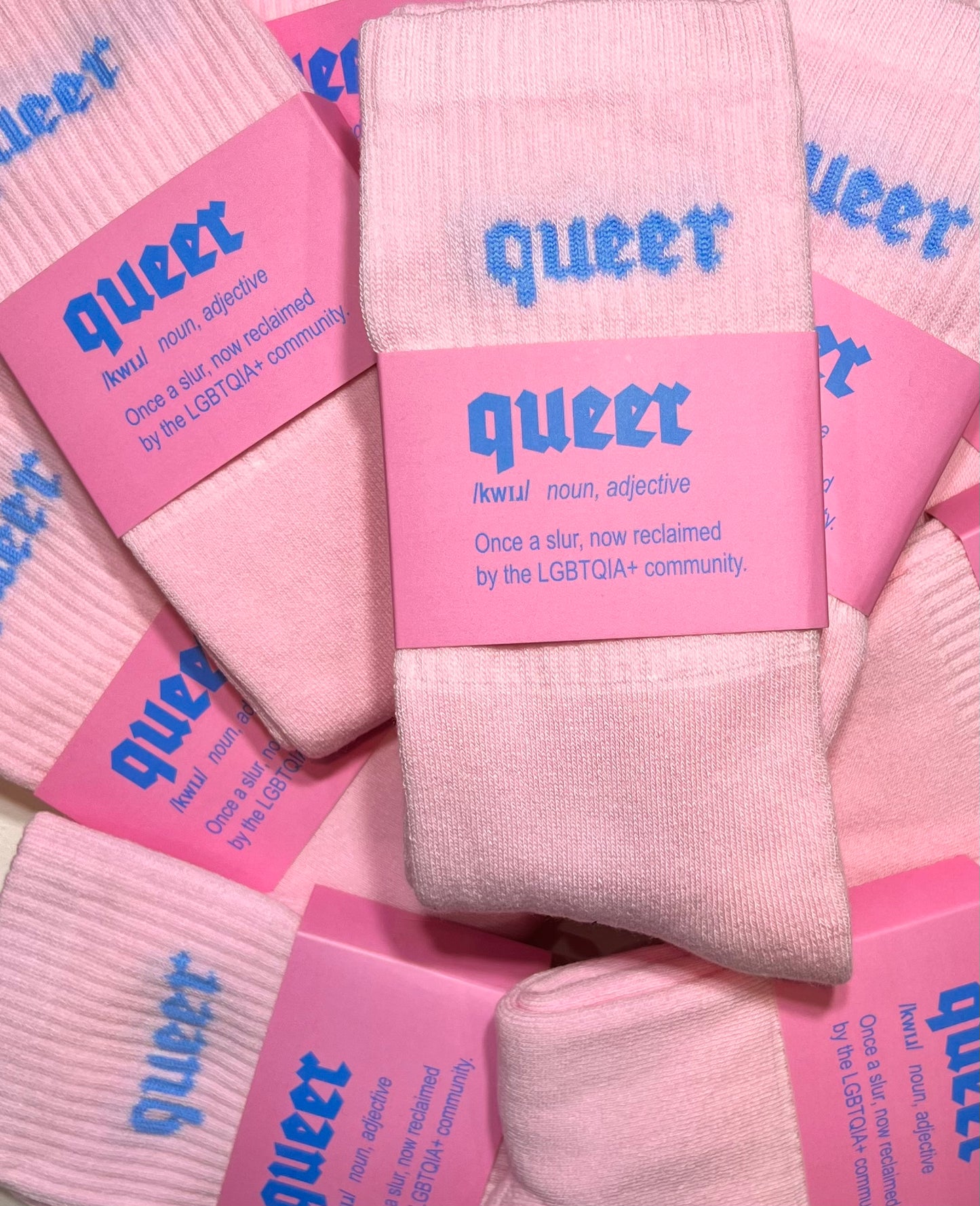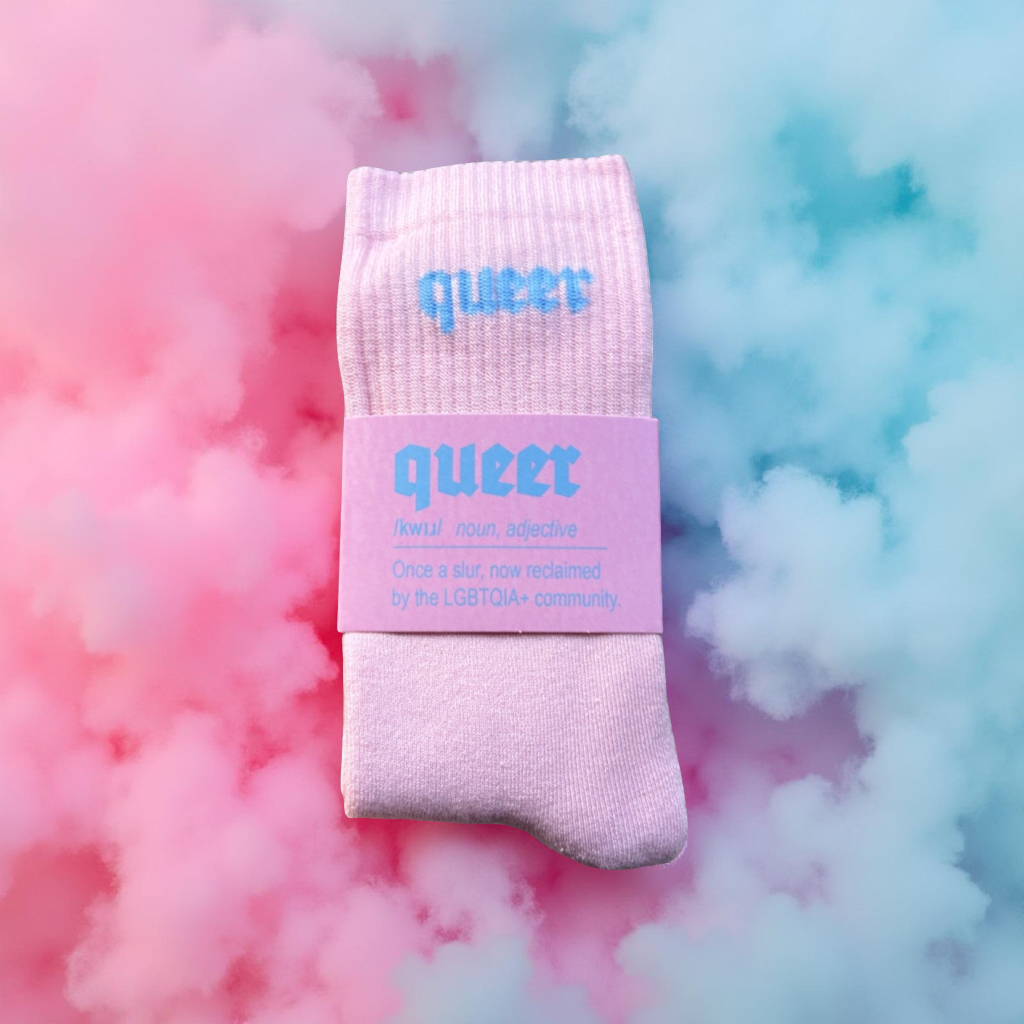 Match these soft and comfy crew socks with our “Queer” Tees.