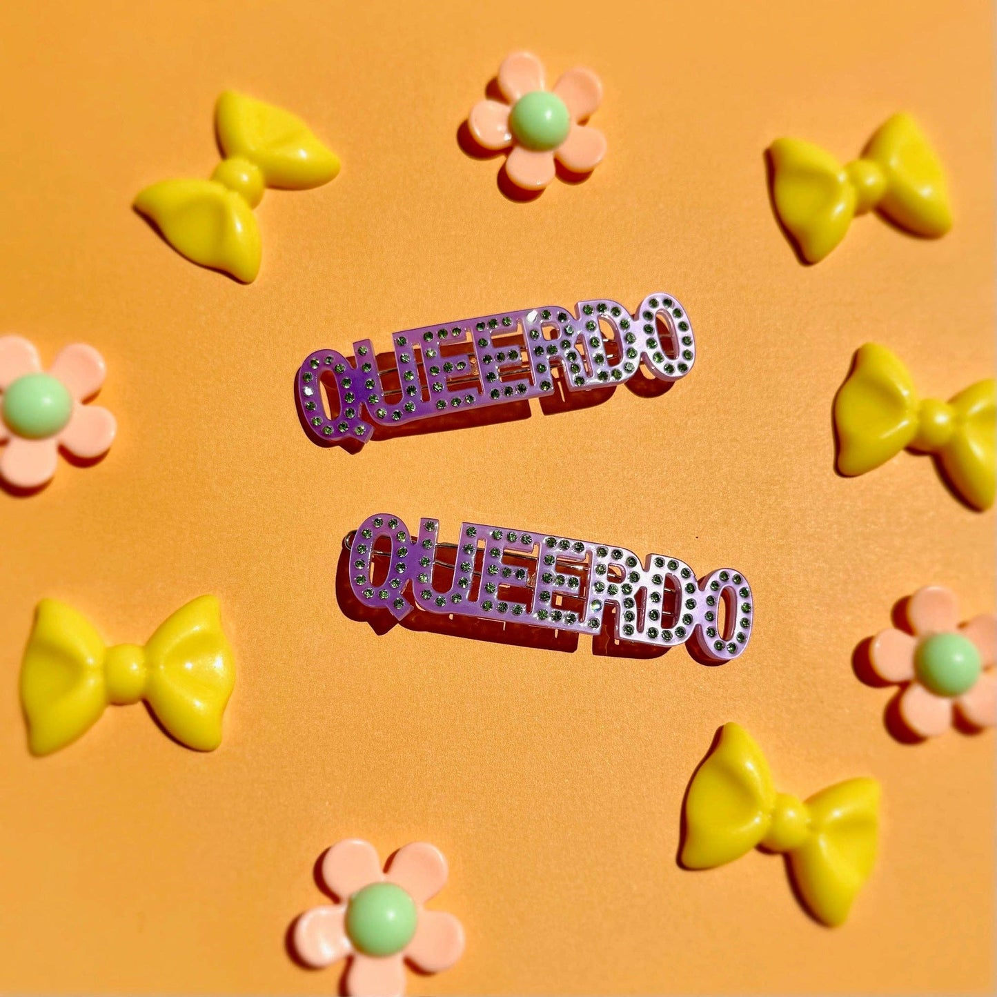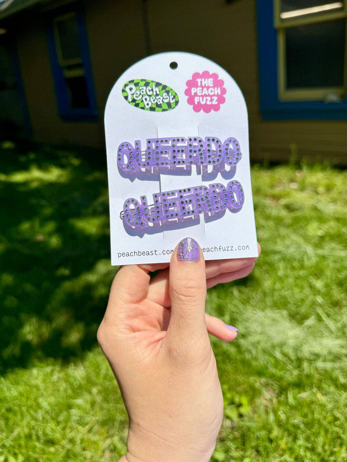 Each set includes two (2) hair clips. Hair clips are purple with green gems spelling out "queerdo".
