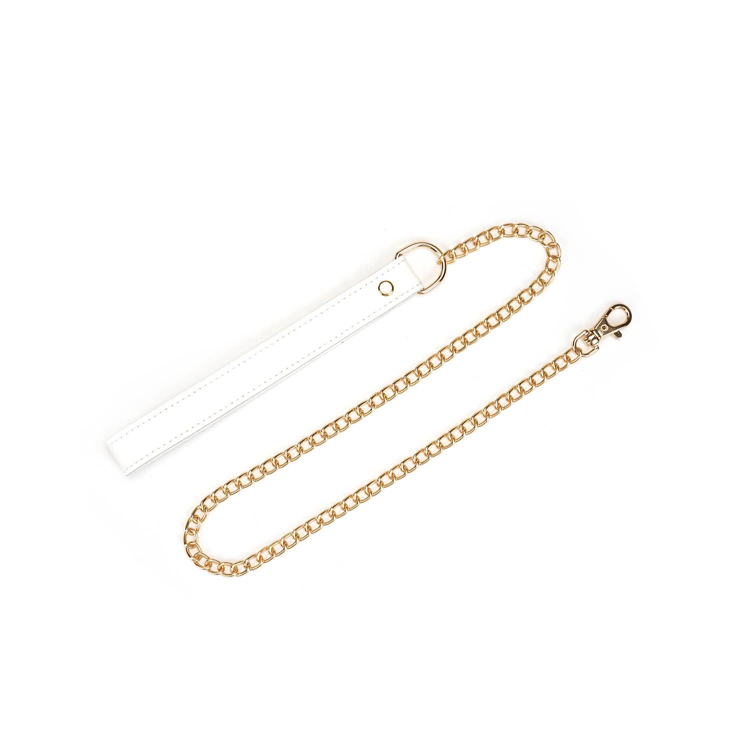 Attached is a D ring to be used with the chain leash with a fastened leather strap.